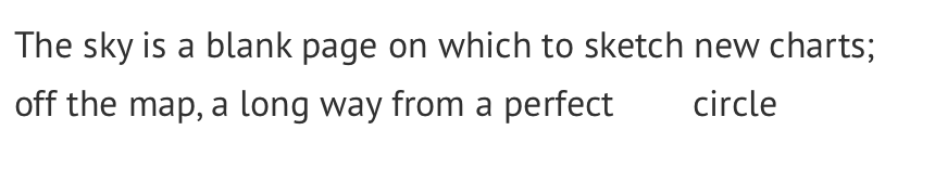 In this tectonic vision, ‘she’ is molten rock from the earth’s core, a liquid solid, a paradox, suffocated by her own lava. She longs to ‘unpeel, escape’ to ‘shrug off’ her ‘whalebone cage.’ Her jail, we sense, cannot hold her much longer. Each staggered line gives form to the fractures Garland describes. Then in other poems, the speaker is stratospheric, ecstatic. In ‘Planetary wobble,’ for example: