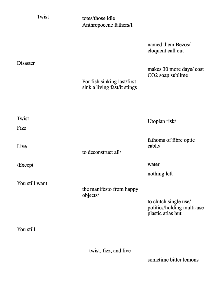 Michael Black is finishing a PhD at the University of Glasgow, on Virginia Woolf and William Blake. His work in progress writing is most easily accessible online via the poetry journal and forum, Adjacent Pineapple. He was included in an anthology edited by Colin Herd, made for the centenary of the poet Edwin Morgan, published by Speculative Books, and he has two pieces in the latest issue of a magazine of experimental writing called –algia. He hopes you will love to support these independent publishers.