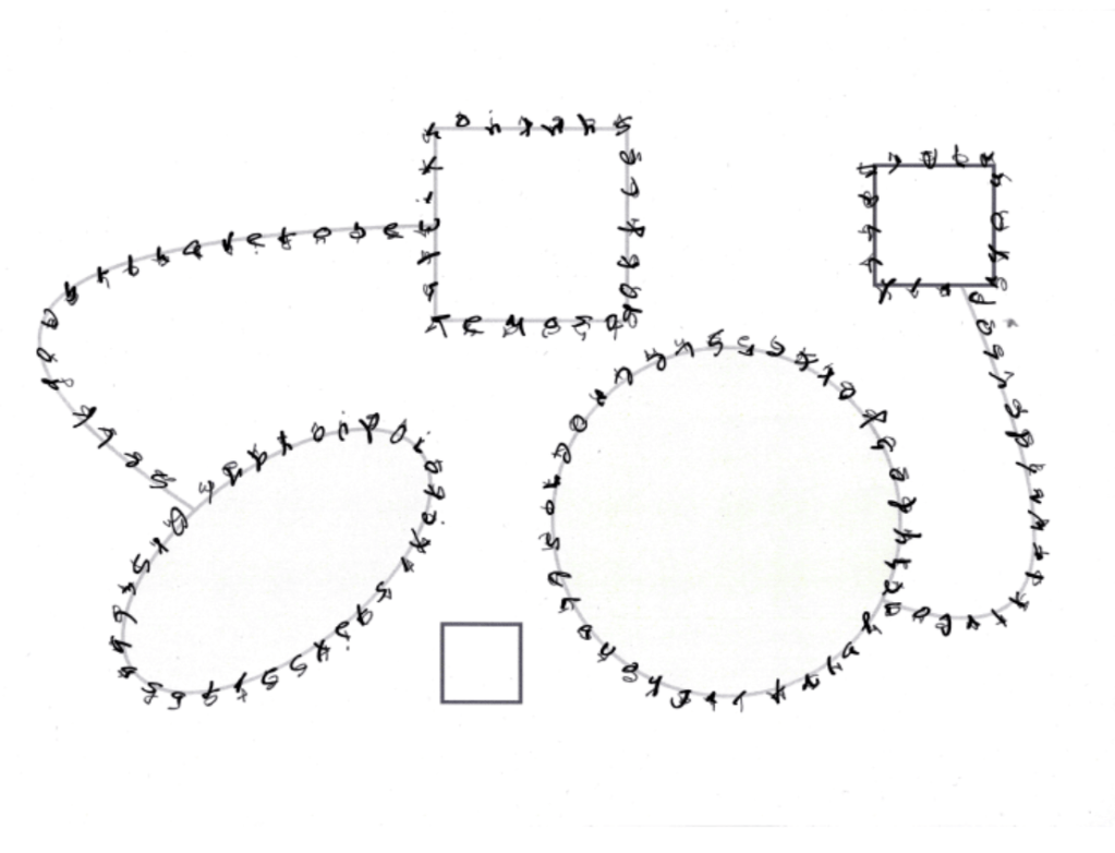 Digital collage – asemic writing in pencil and ink on printer paper, scanned and merged with digital elements using Apple ‘Keynote’.