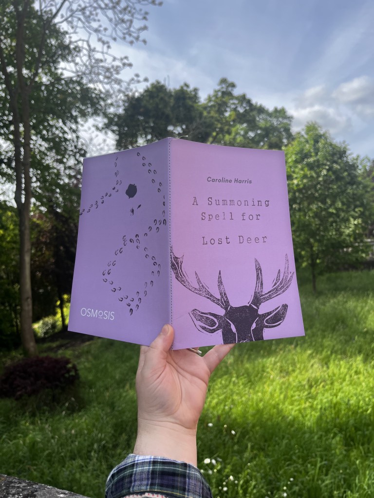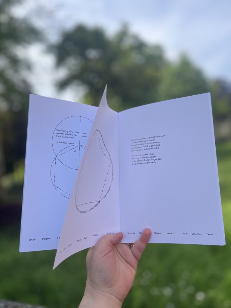 Caroline Harris is a writer and artist, publisher and editor based in Bath. Previous pamphlets include SCRUB Management Handbook No.1 Mere (Singing Apple Press), Cut-out Bambi and Type Flight (Small Birds Press). Poetic artists’ books have been collected by the National Poetry Library, Bodleian Library and Bavarian State Library. Poems and articles have appeared in anthologies, magazines and journals, including Living with Other People (Corrupted Poetry), Rewilding: An Ecopoetic Anthology (Crested Tit Collective) and The Blue Notebook: Journal for Artists’ Books. Language art has been exhibited at The Plough Arts Centre, Devon and Art Park Gallery, Rhodes, among others. Caroline is a creative practice PhD researcher at Royal Holloway, University of London, studying the poetics of deer in relation to the emerging field of Cute Studies.