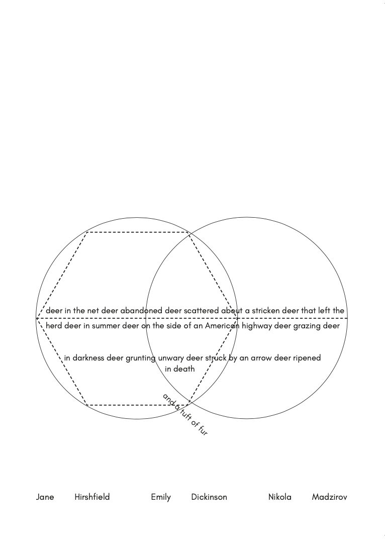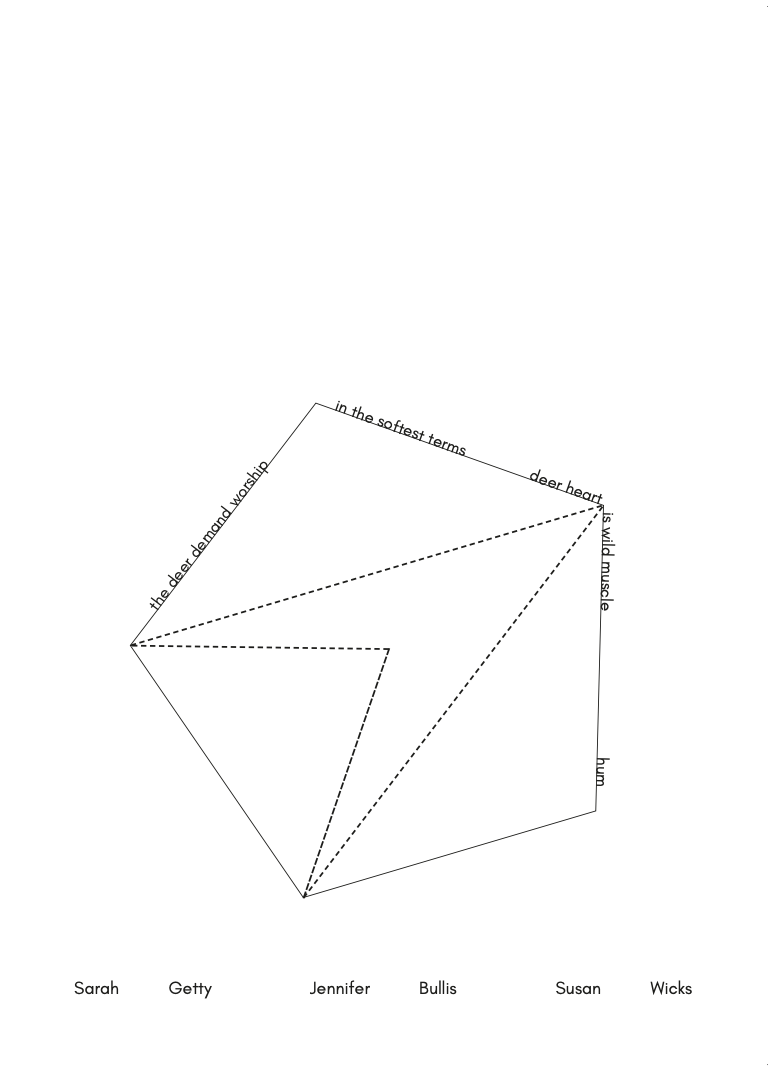 An elegy for those lost through culling, hunting, injury, and roadkill, this sequence calls deer forth to escape, overrun, and make new pathways through the page. The form of this sequence borrows from the straight lines, circles, and planes of Euclidean geometry. The collaged language of Harris’ sequence becomes a herd, breaking free from the fencing of the poem.