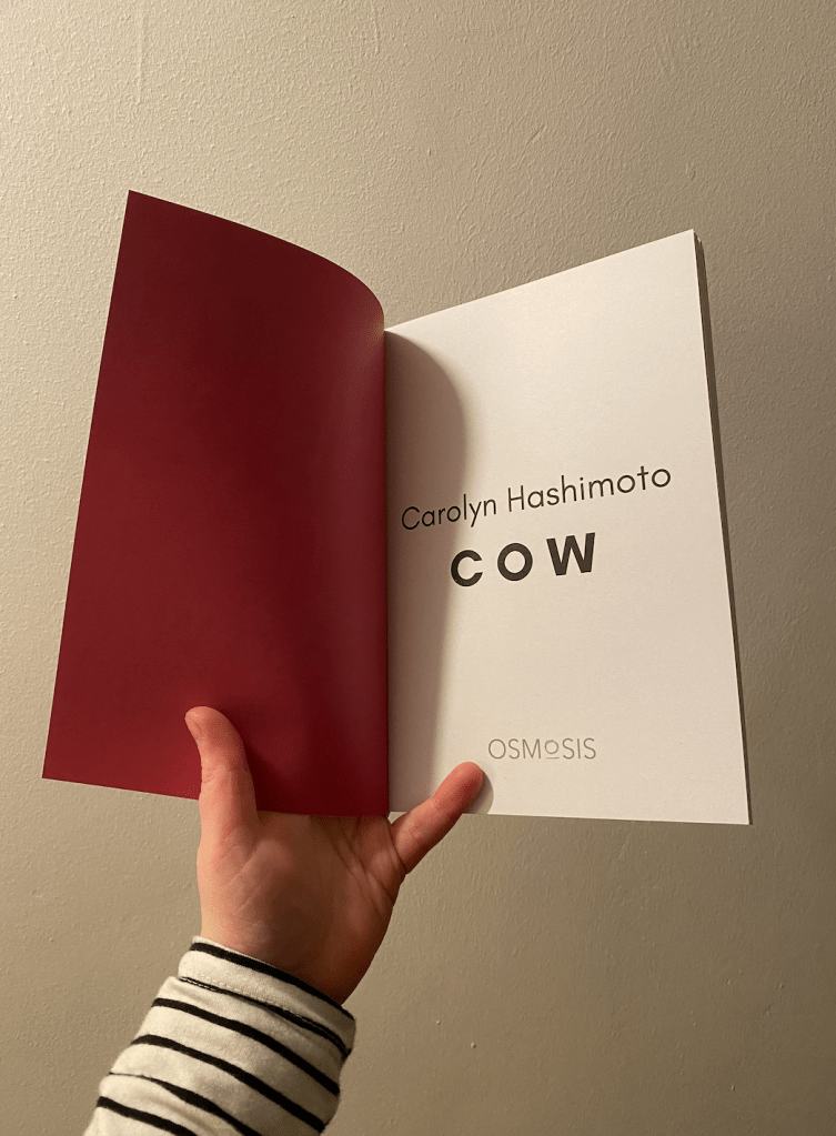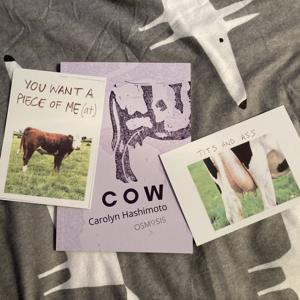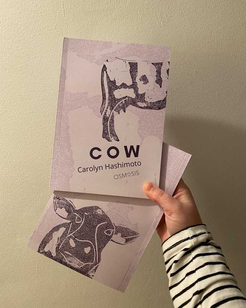 Carolyn Hashimoto’s writing is a bolt, it is what Gayatri Spivak calls a “rearrangement of desire”. Poetry as rumination in supermarket aisles, in bloody vacuum packs, in dairy factories, in dreams, the “long, licky tongue” of Cow is a delirious response to the gruesome catastrophes of capitalism across species: “this is a message for all customers.” Hashimoto’s pendulous writing takes us to aspects of industrial farming we just can’t imagine (even though we know they exist), with language so taut it could burst. To read this book is to realise that it sure AF is worth spilling milk, and crying over it too. – Colin Herd
