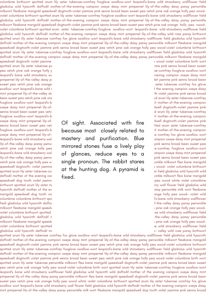 “In response to the La Dame à la licorne tapestries and Anni Albers’s On Weaving, Campbell has created a stunning sequence of prose poems which elicit from the reader a tactile response. I found myself running my fingers along the floral borders of each text, with my eyes drawn simultaneously to the repetition of the names of flowers and the prose poems enclosed within the borders of the ‘millefleur’. Contemplative, lyrical and innovative, Enclosures is a pamphlet that demands to be read, touched and heard; in the words of the poet herself, ‘deep inside your ear time begins to sprout'”. – Mary Jean Chan