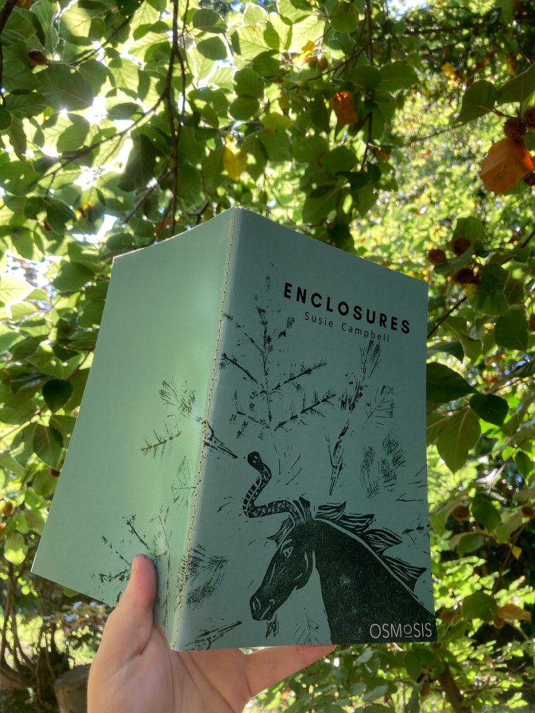 “In Enclosures, Susie Campbell has crafted such a rich and sensual tapestry of language. Physically and textually restricted – by the page edges, by the rectangular word-frame of each poem portrait – this collection continually expands beyond its bounds, ‘fraying’ into questions, wonderings, yearnings for the wildness of touch, the sting of earth, looping into contemplations on gender, ecological destruction, divinity. Meshing subject, poet and reader by addressing all as ‘you’, they travel through time and space, drawing the thread of narrative from the codes and hierarchies of the fifteenth century to our present ‘enclosed’ times. The lush but spare shuttle of words takes us from the ‘millefleur’ border of wildflower names, through the central panel of each sense-themed poem, out again into the surround: back and forth, inner to outer. These are poems of intricacy and intimacy. Each reading brings new bright discoveries and textures.” (Caroline Harris)