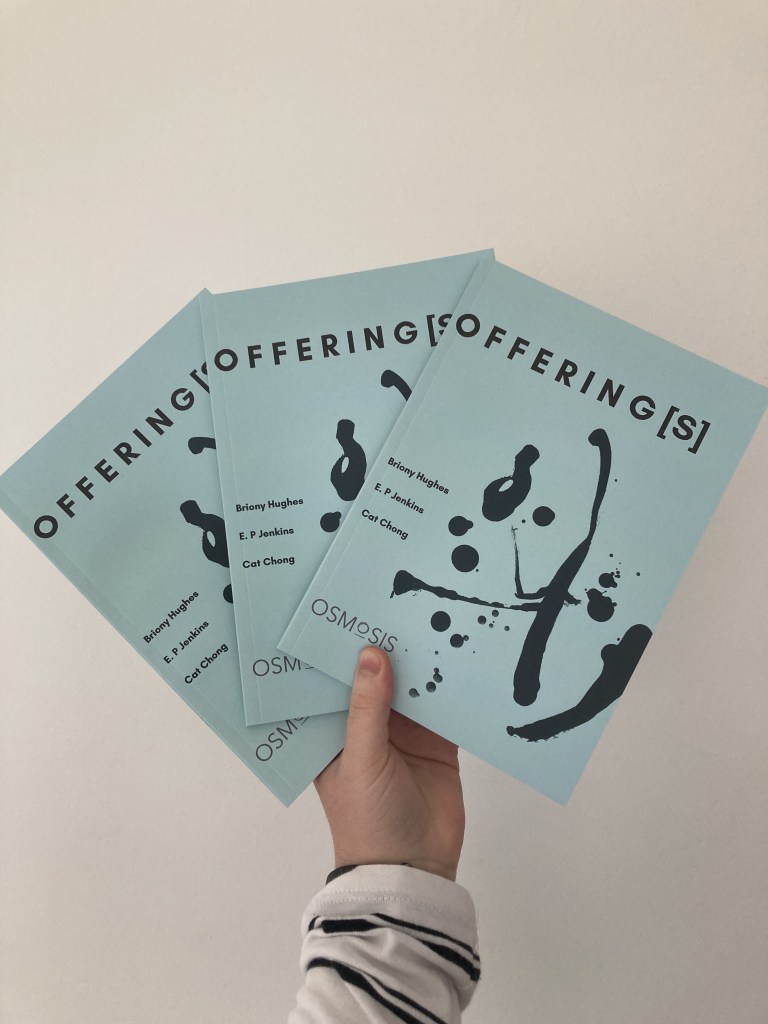 Offering[s] is a collaborative project celebrating 20 years of Poetic Practice at Royal Holloway. Hughes, Chong, and Jenkins offer a series written, visual, film, performance, and object-based poetic responses to several of the many poets who have emerged from the MA programme, including Sophie Robinson, Prue Bussey-Chamberlain, Astra Papachristodoulou, Karenjit Sandhu, Nisha Ramayya, and J.D Howse. Works documented in the book were originally developed for the 2022 Runnymede International Literature Festival.